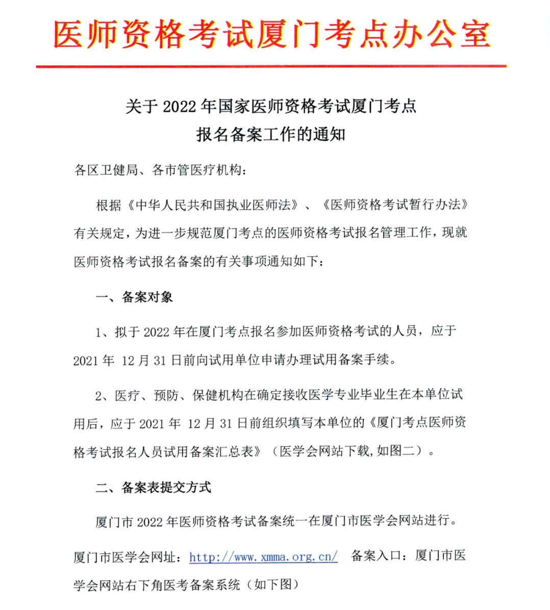 福建厦门发布《关于2022年医师资格考试报名备案工作的通知》,拟于2022年在厦门考点报名参加医师资格考试的相关人员,请于12月31日前向试用单位申请办理医师资格考试备案手续,详细内容由考试知己小编整理如下: