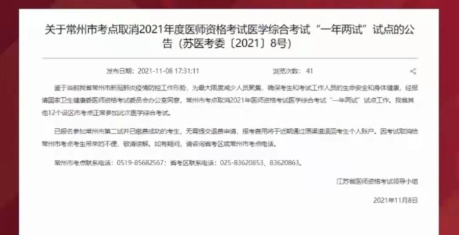 常州考点取消2021年医师资格考试“一年两试”试点