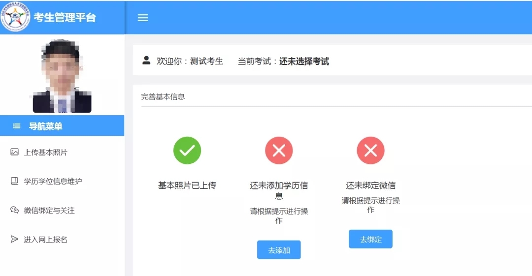 注册完成登录网上报名系统后,按照页面提示进行上传基本照片、维护学历学位信息和绑定微信操作。