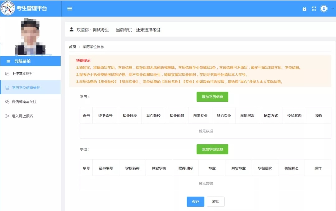 根据系统提示,添加学历或学位信息,添加完成后,点击【保存】按钮,完成学历或学位信息的维护。