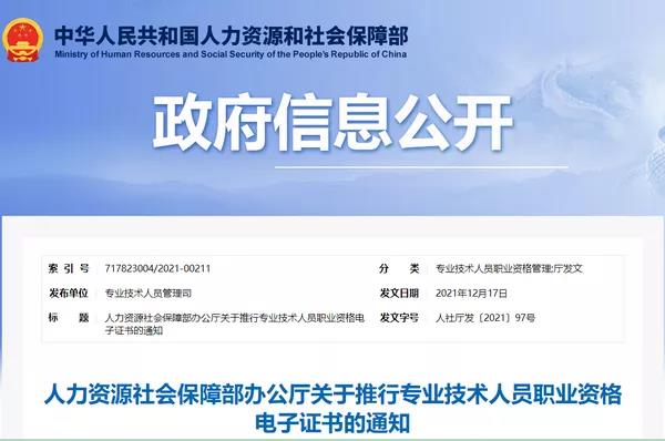 近日,人社部发布通知,在专业技术人员职业资格中推行电子证书,其中包含“卫生专业技术资格(初中级),并且电子证书与纸质证书具有同等效力!