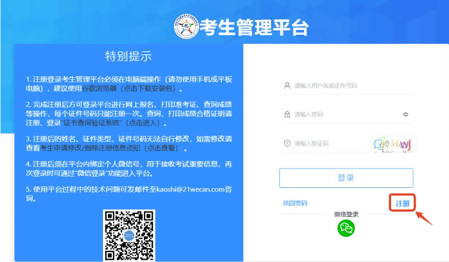 (1)务必由考生本人进行注册操作,确保信息真实有效。 点击“注册”后信息将无法自行修改,请认真核对填写内容。